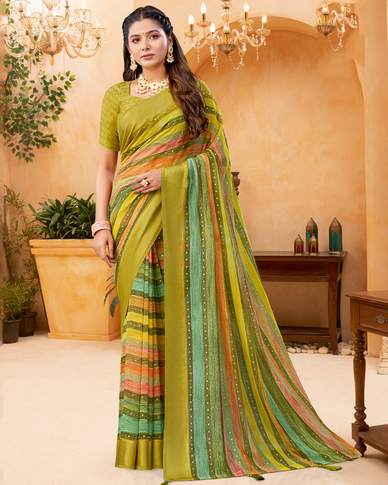 Vishal Prints Ginger Brown And Moss Green Digital Print Georgette Saree With Foil Print And Weaved Satin Patta
