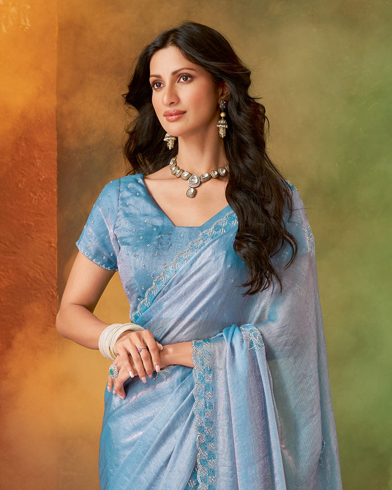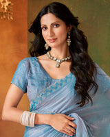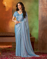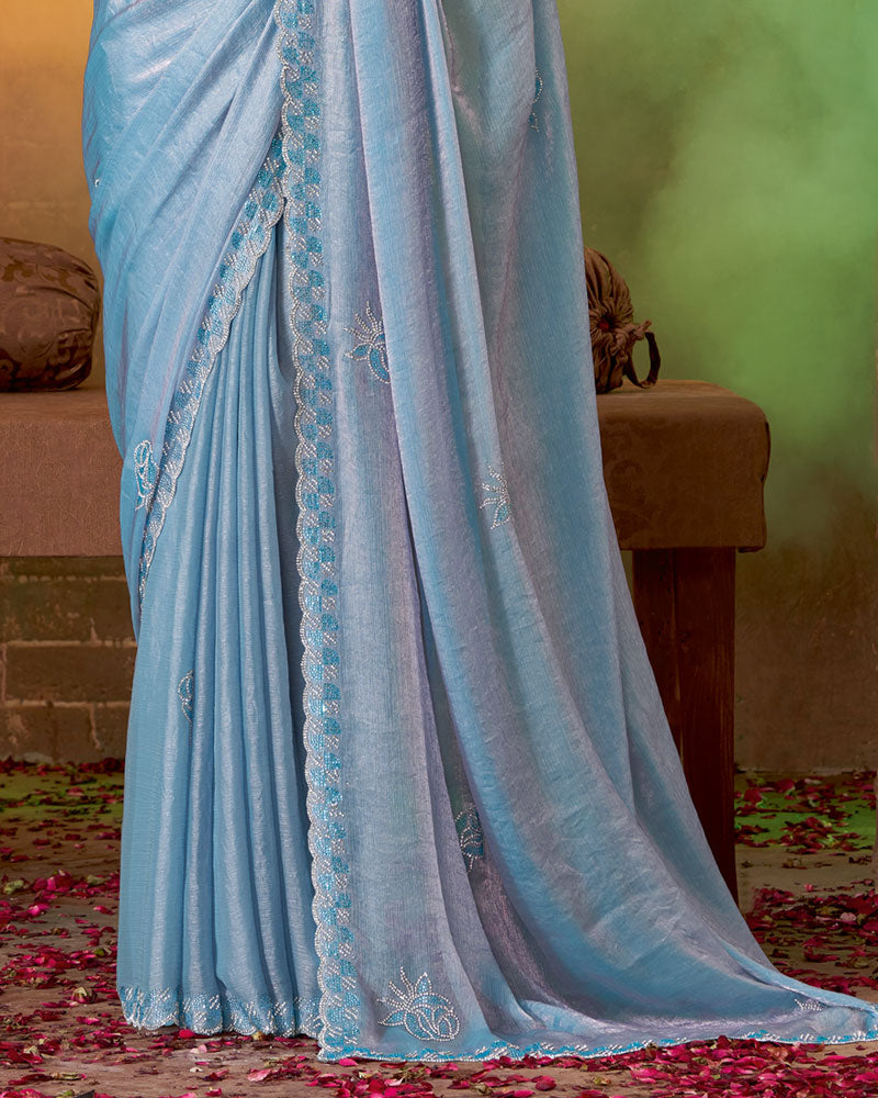 Vishal Prints Glacier Blue Fancy Chiffon Swarovski Work Saree With Cut Work Border