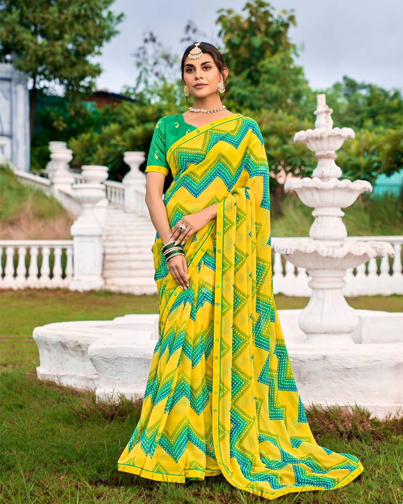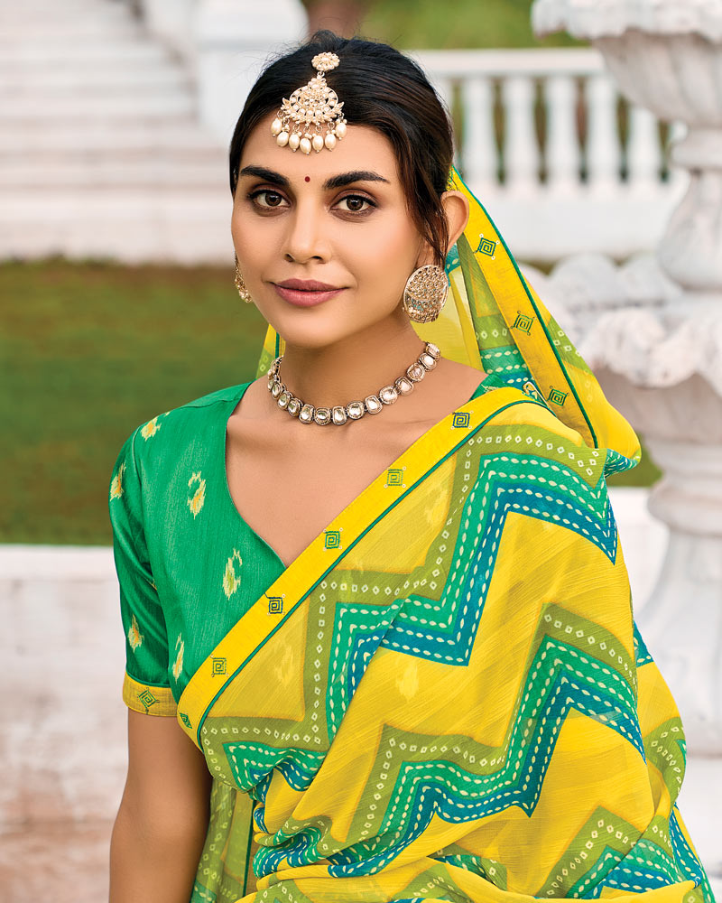 Vishal Prints Golden Yellow And Jade Green Printed Chiffon Saree With Fancy Border