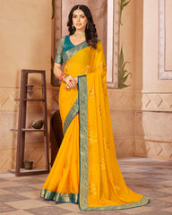 Vishal Prints Golden Yellow Chiffon Saree With Foil Print And Zari Border
