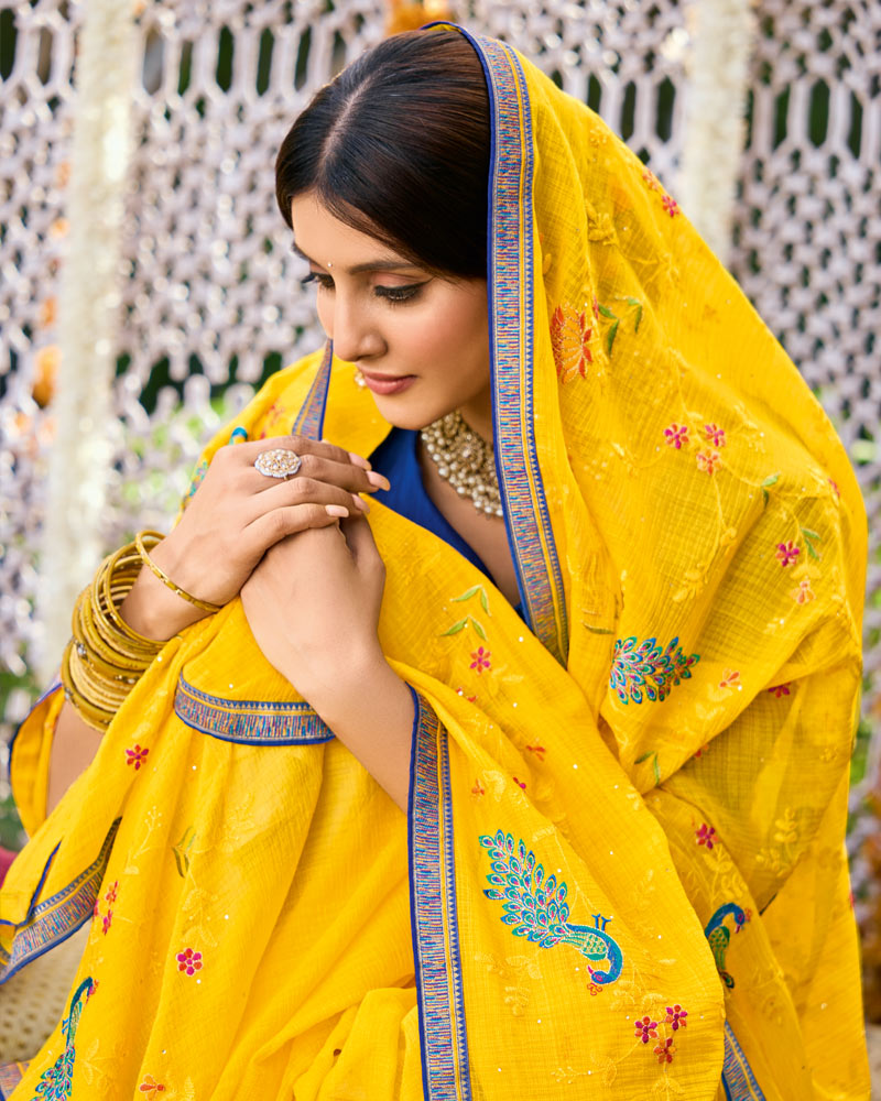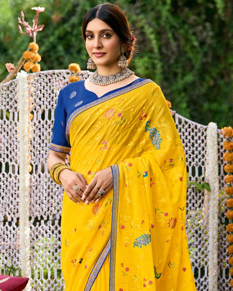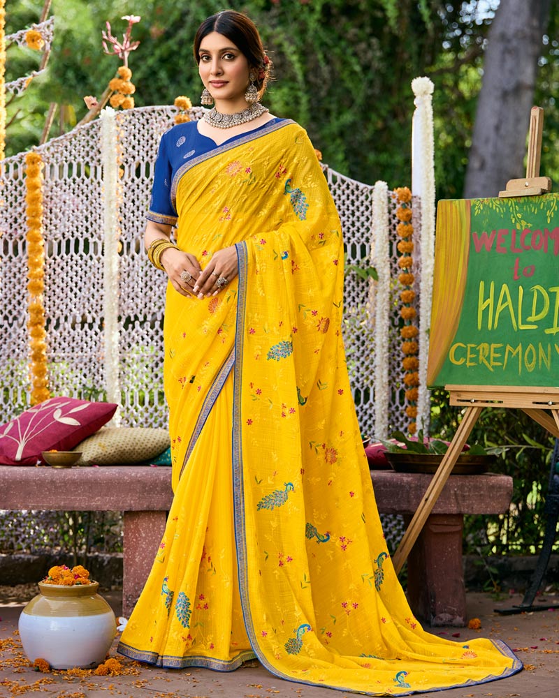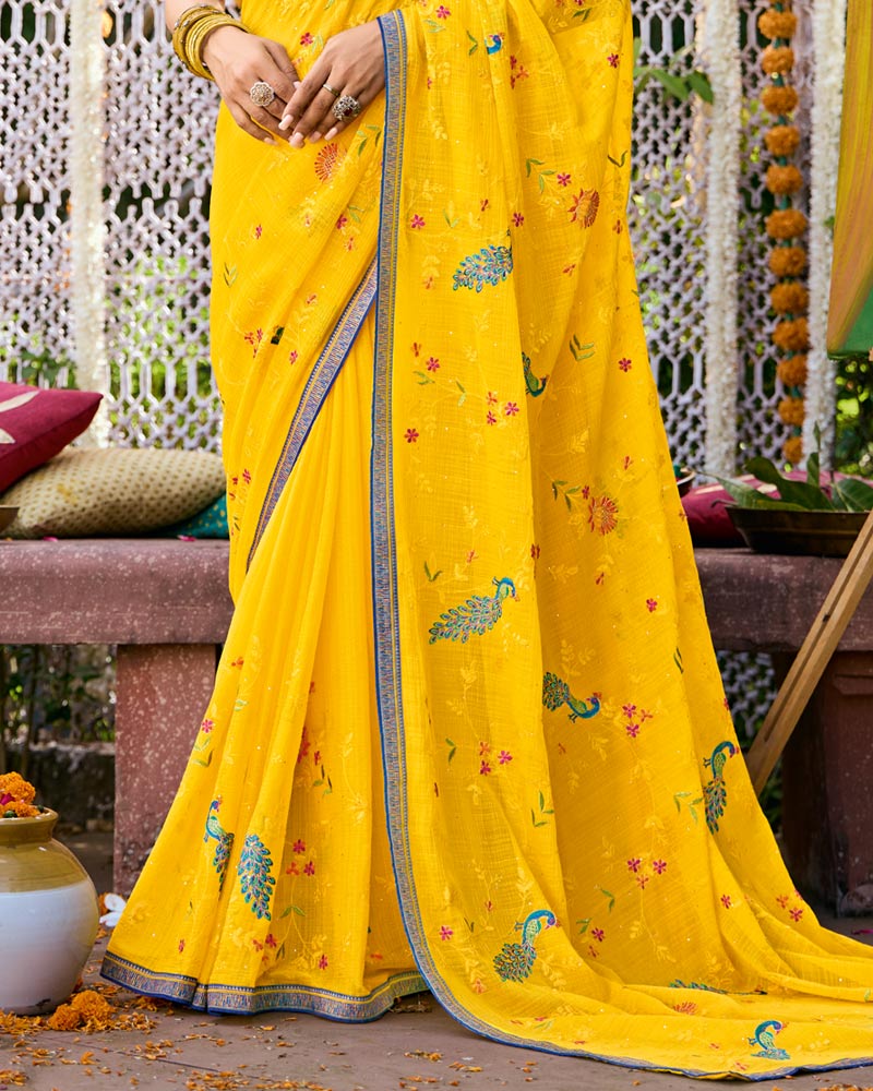 Vishal Prints Golden Yellow Designer Fancy Chiffon Saree With Embroidery-Diamond Work And Border
