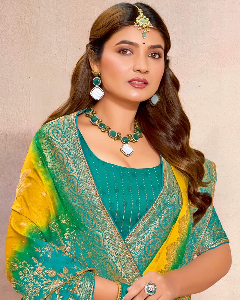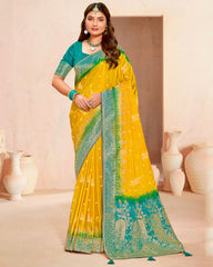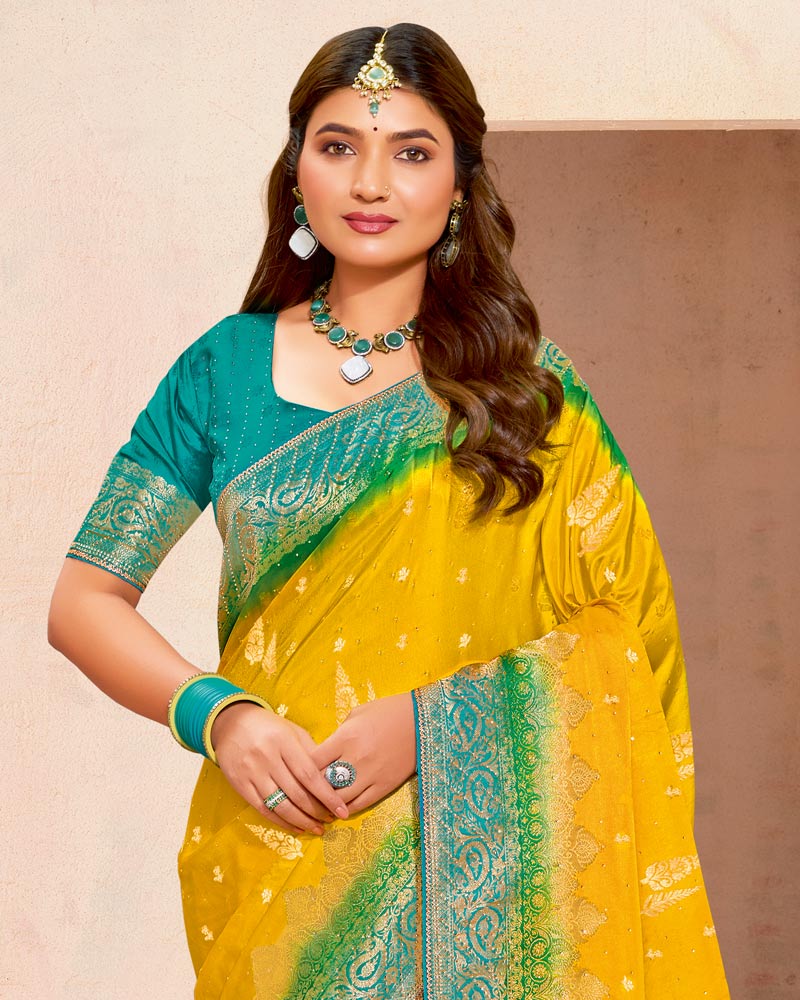 Vishal Prints Golden Yellow Designer Satin-Dola Silk Saree With Diamond Work And Tassel