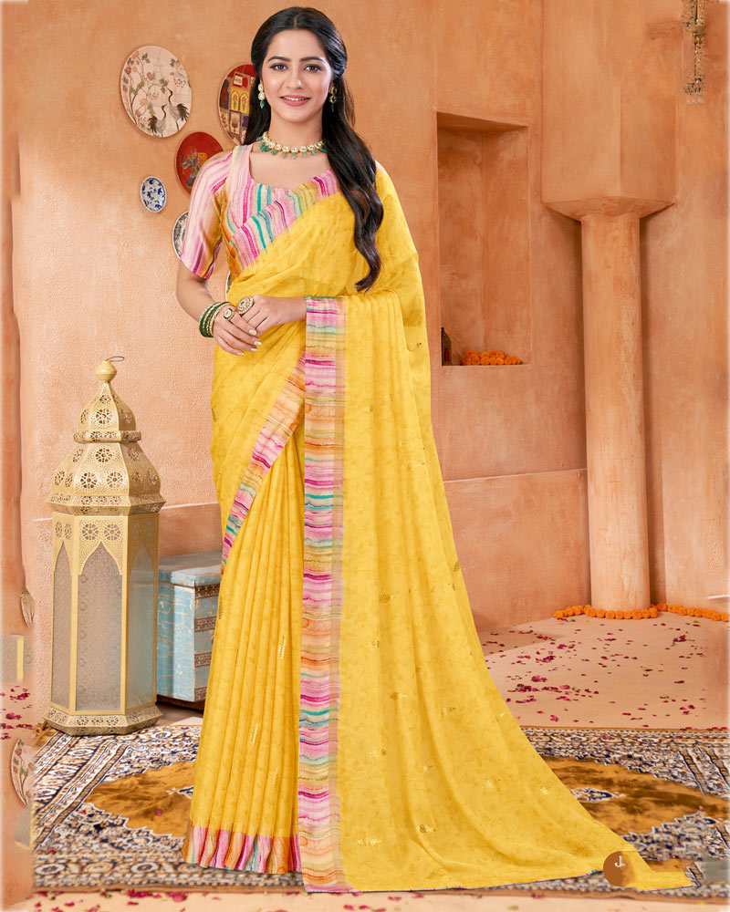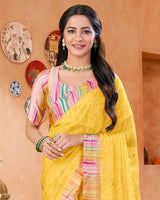 Vishal Prints Golden Yellow Digital Print Chiffon Saree With Foil Print And Weaved Satin Patta