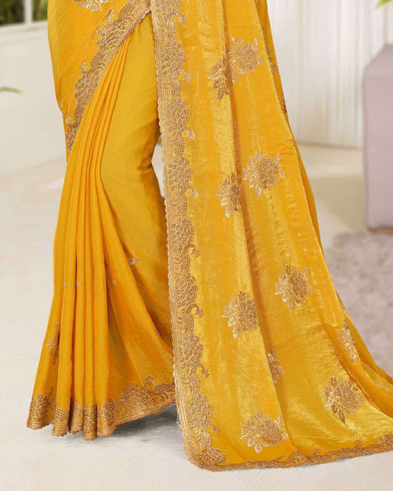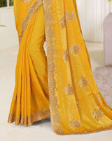 Vishal Prints Golden Yellow Fancy Satin Saree With Embroidery-Swarovski Zari Butta And Cut Work Border