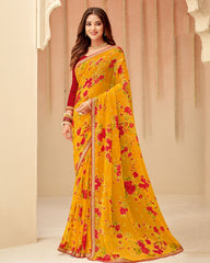 Vishal Prints Golden Yellow Printed Chiffon Brasso Saree With Fancy Zari Border