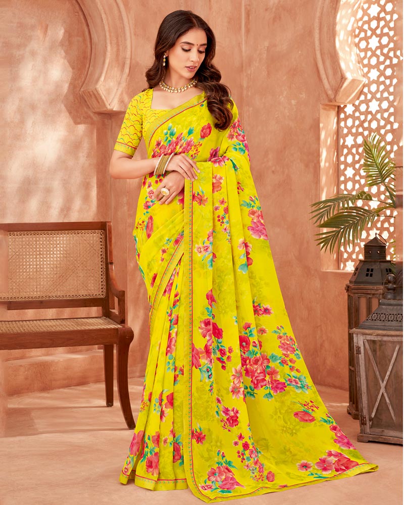 Vishal Prints Golden Yellow Printed Georgette Saree With Fancy Border