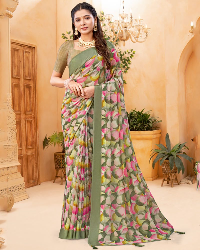 Vishal Prints Greyish Green Digital Print Georgette Saree With Foil Print And Weaved Satin Patta