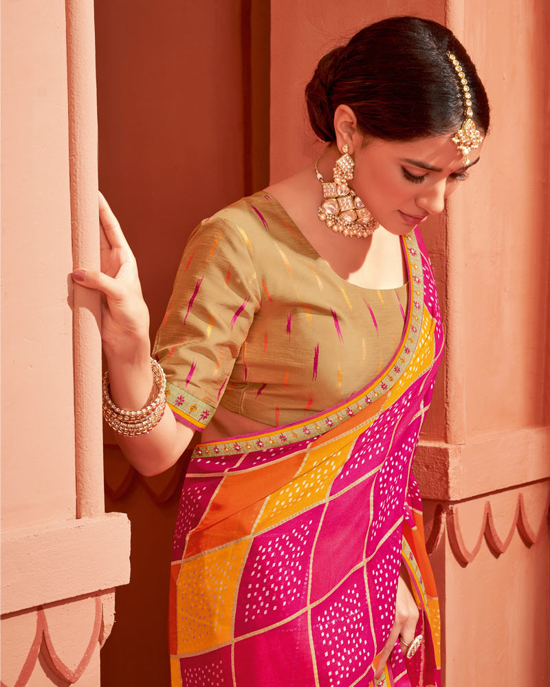 Vishal Prints Hot Pink Printed Chiffon Bandhani Print Saree With Foil Print And Fancy Border