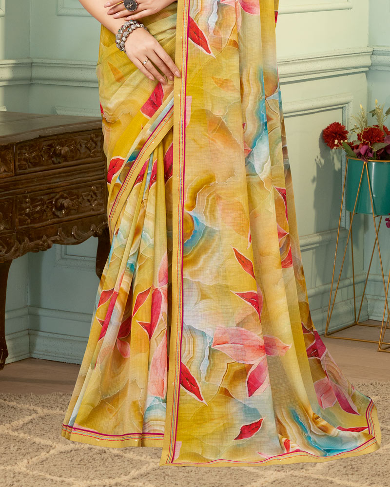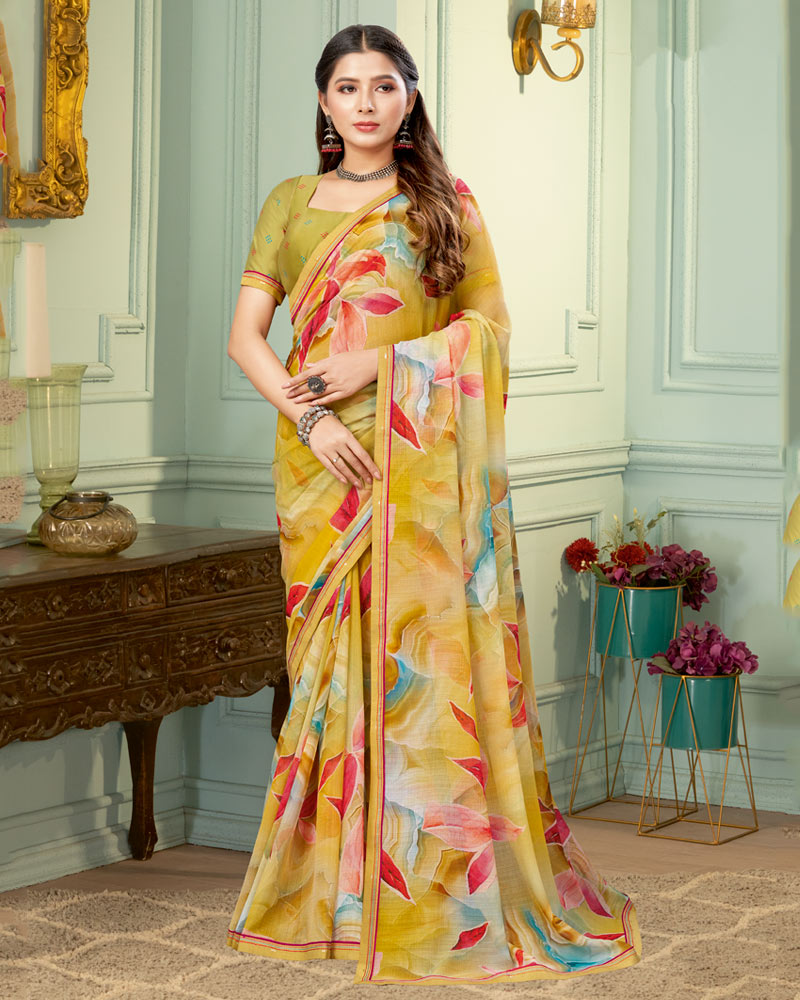 Vishal Prints Indian Yellow Digital Print Fancy Chiffon Saree With Border
