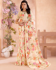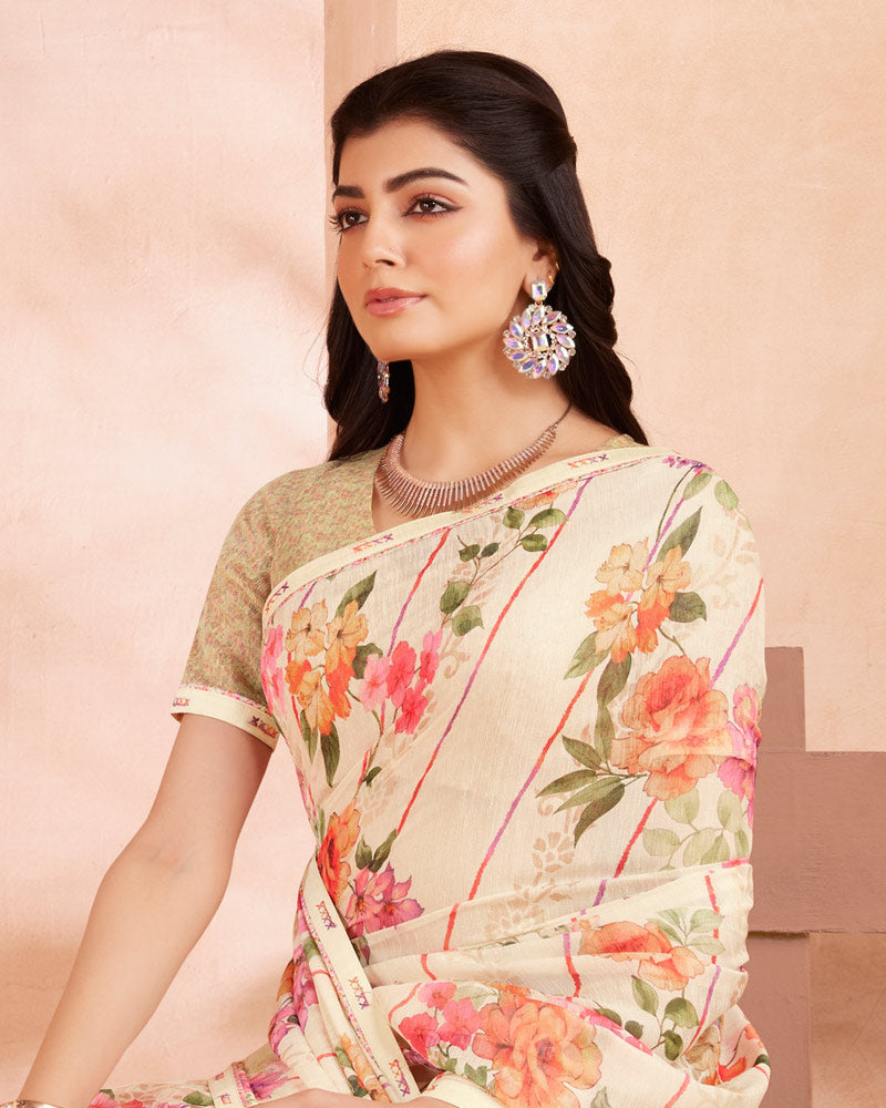 Vishal Prints Ivory Digital Printed Cotton Brasso Saree With Foil Print And Fancy Border