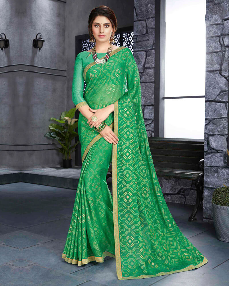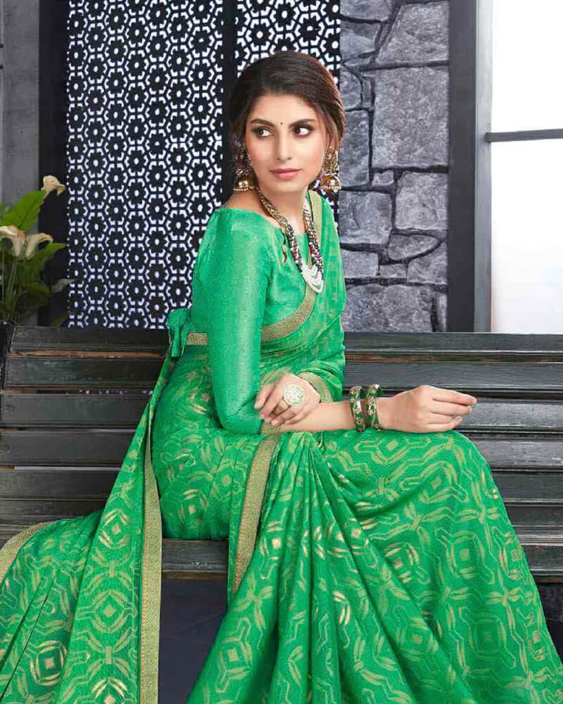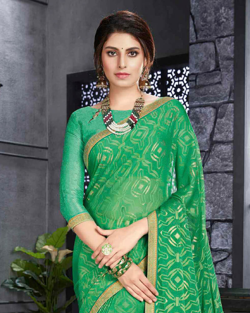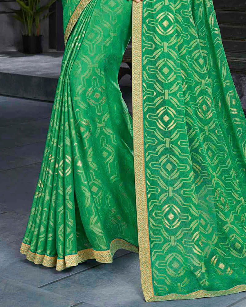 Vishal Prints Jade Green Brasso Saree With Foil Print And Zari Border