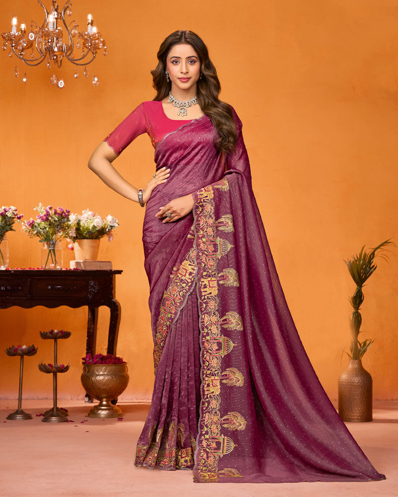 Vishal Prints Light Burgundy Designer Fancy Art Silk Saree With Embroidery-Diamond Work And Cut Work Border