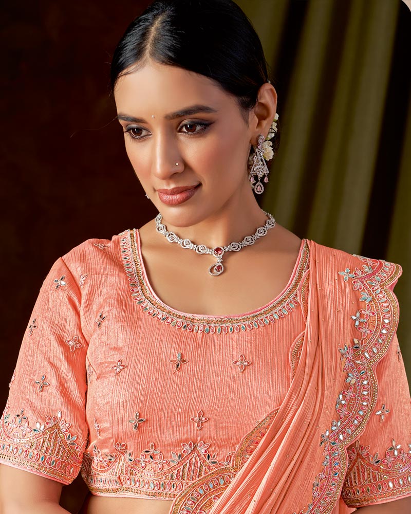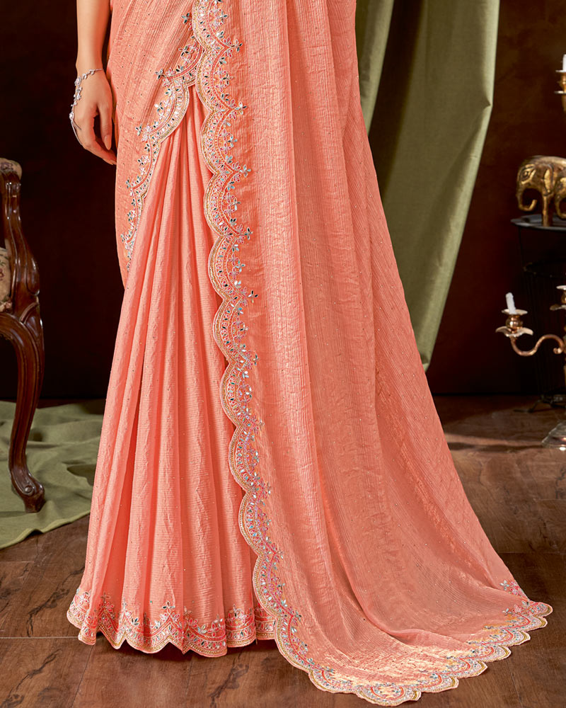 Vishal Prints Light Coral Designer Satin-Chiffon Saree With Embroidery-Mirror Work And Cut Work Border