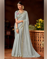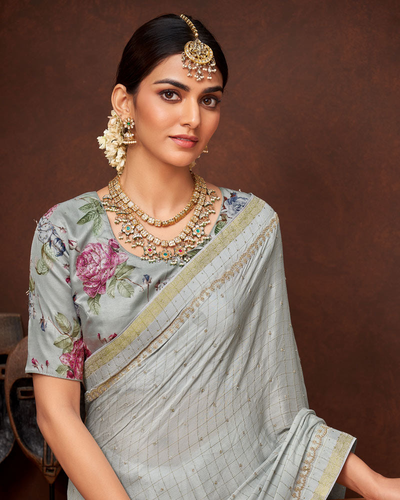 Vishal Prints Light Grey Patterned Pure Chiffon Saree With Zari Lining And Weaving Work Embroidery Border