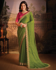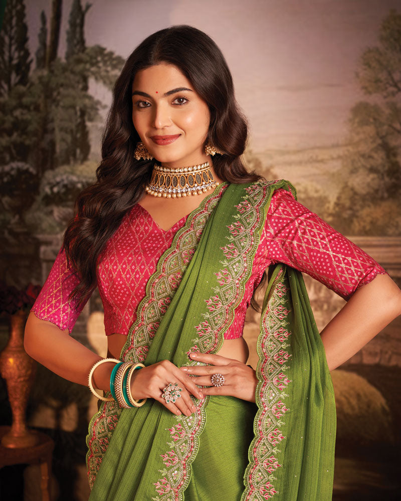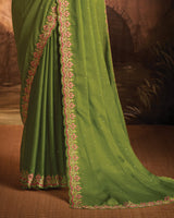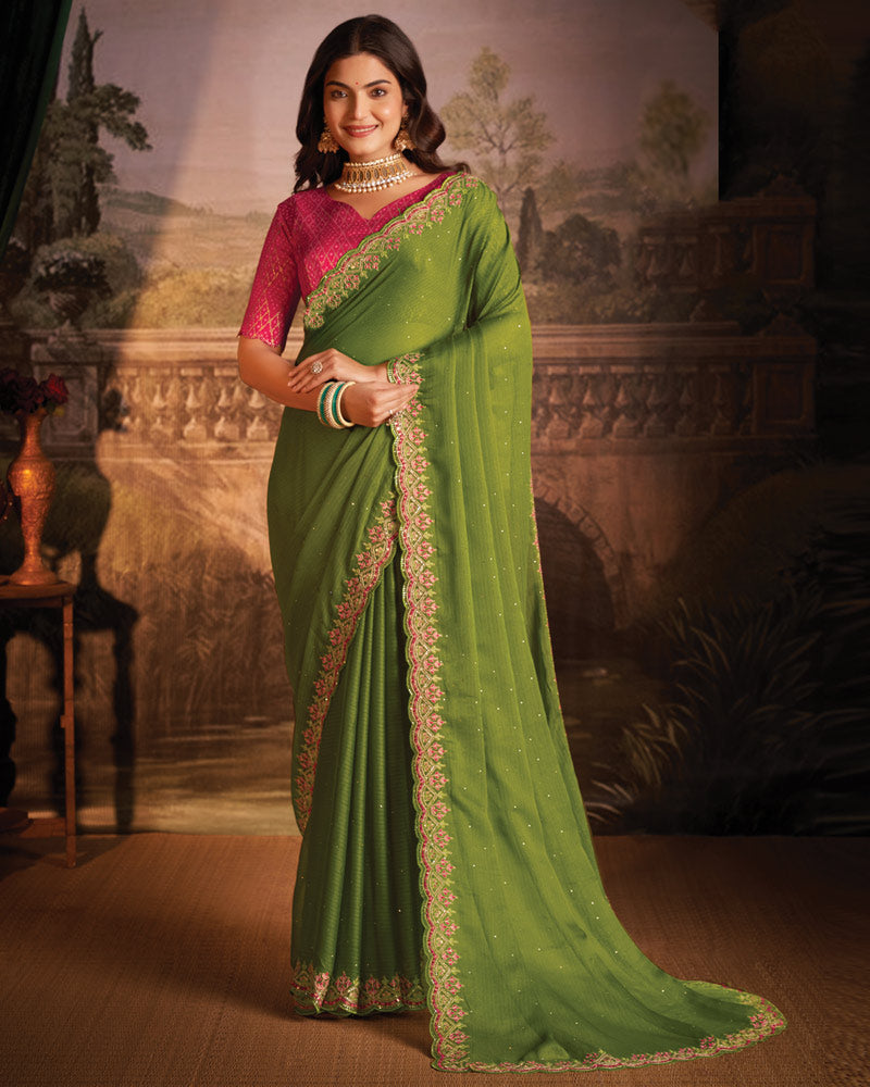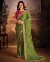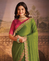 Vishal Prints Light Mehandi Green Designer Zari-Chiffon Saree With Diamond Work And Cut Work Embroidery Border