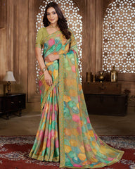 Vishal Prints Light Mehandi Green Digital Print Chiffon Brasso Saree With Fancy Border
