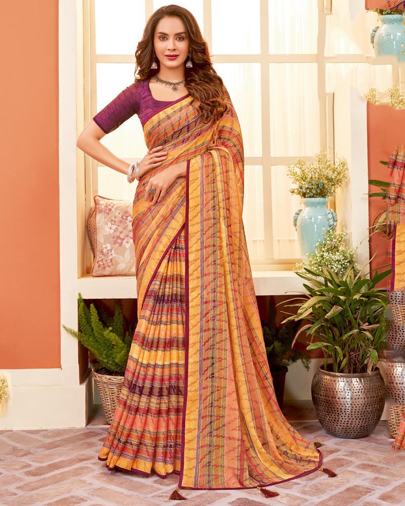 Vishal Prints Light Mustard Digital Print Fancy Brasso Saree With Core Piping And Tassel