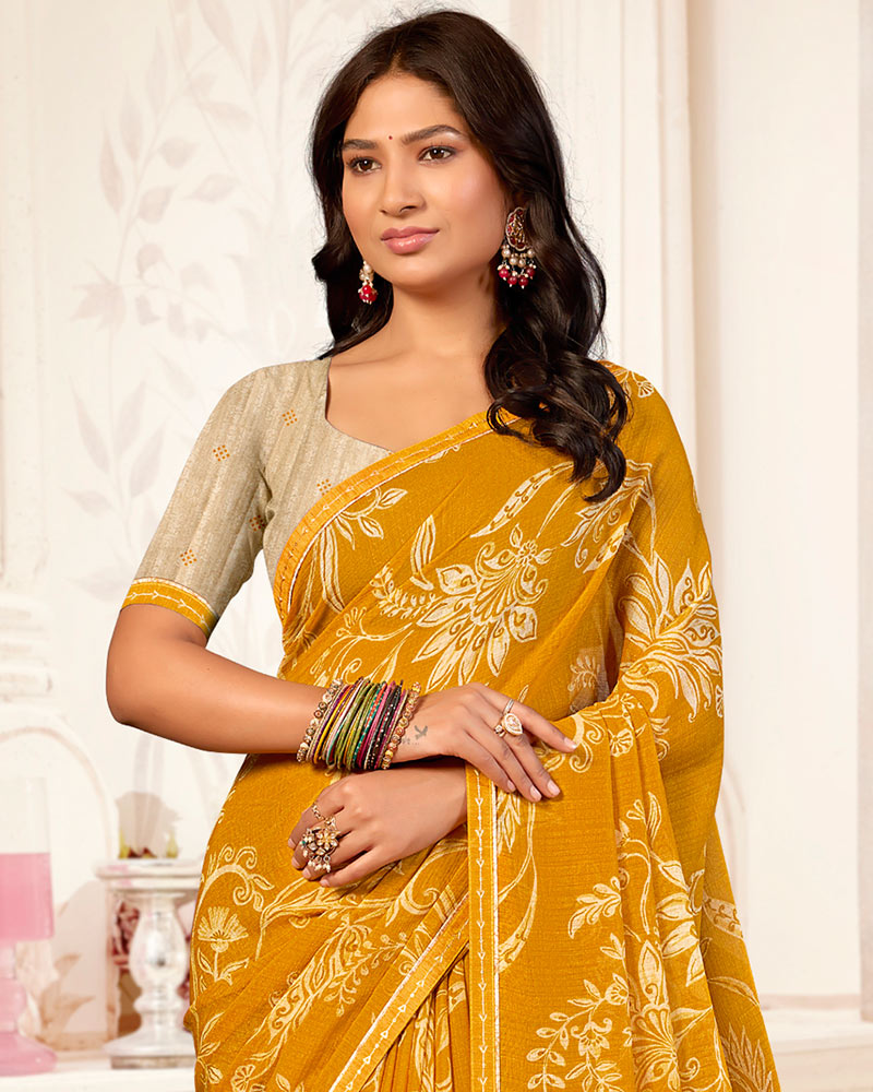 Vishal Prints Light Mustard Printed Chiffon Saree With Fancy Border