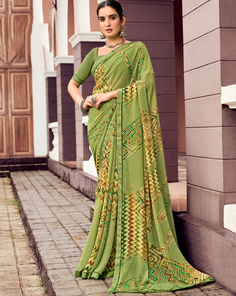 Vishal Prints Light Olive Green Digital Print Georgette Saree With Fancy Border