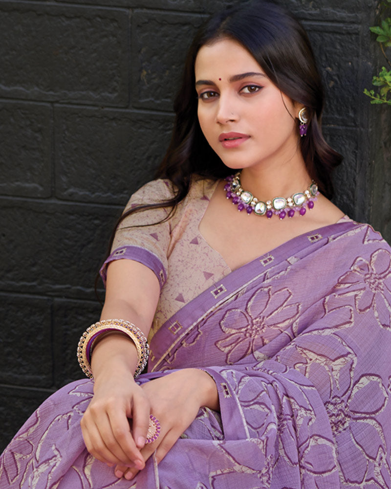 Vishal Prints Light Pastel Purple Printed Chiffon Saree With Fancy Border