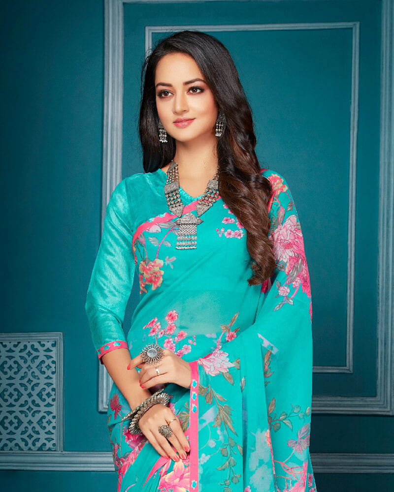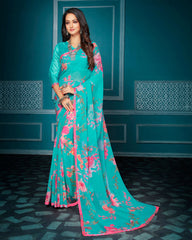Vishal Prints Light Sea Green Floral Print Georgette Saree With Piping