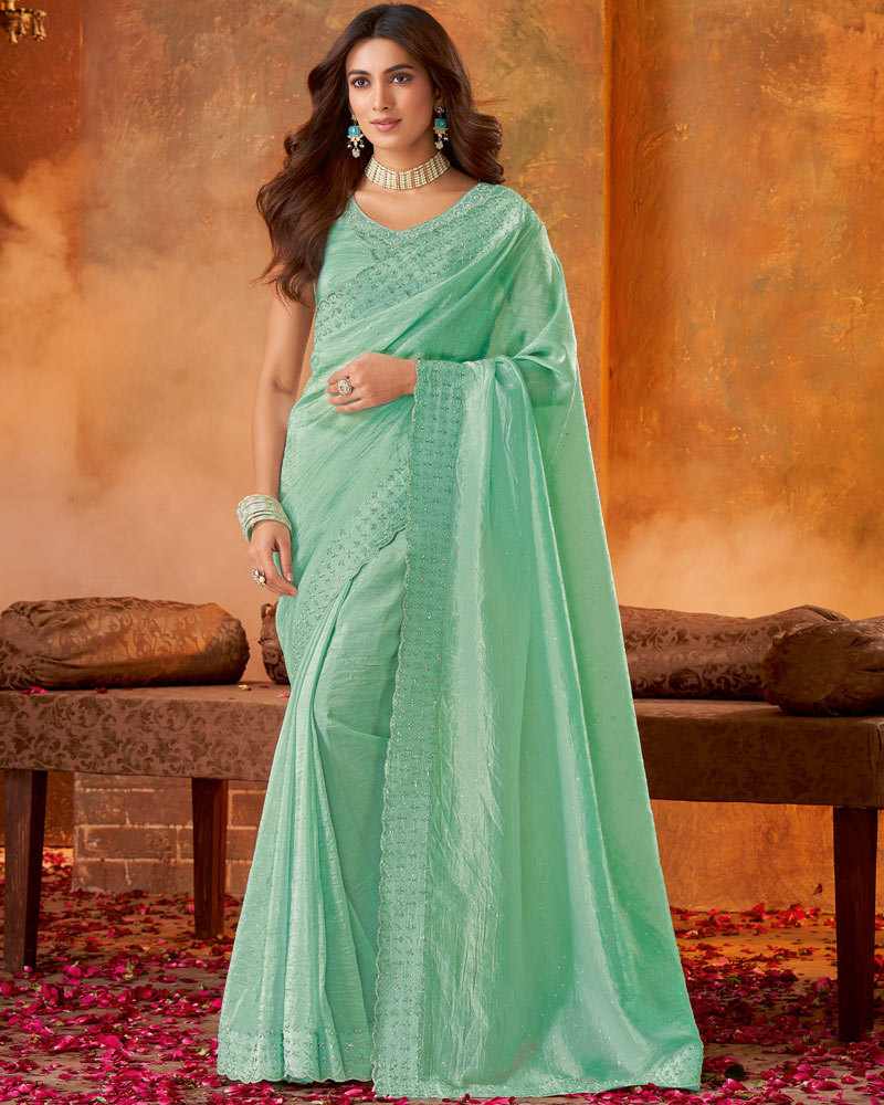 Vishal Prints Light Teal Green Crushed Zari Chiffon Saree With Cut Dana-Jarkan Work And Cut Work Border
