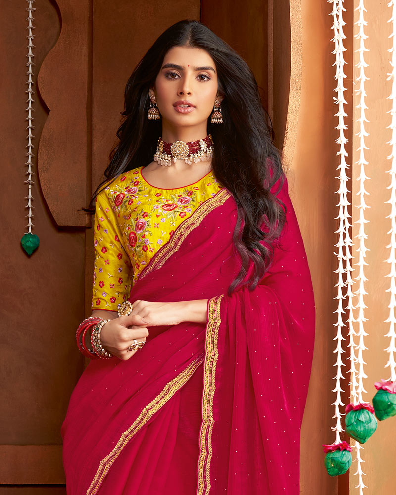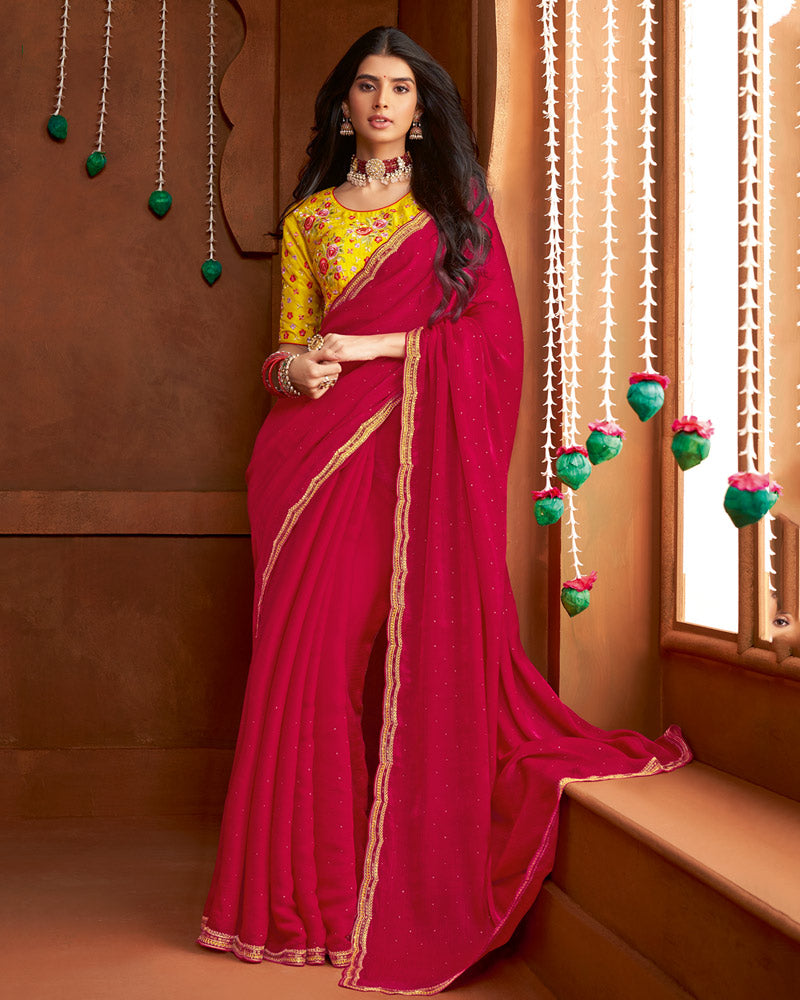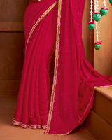 Vishal Prints Lipstick Red Fancy Satin Cut Dana-Swarovski Work Saree With Cut Work Border