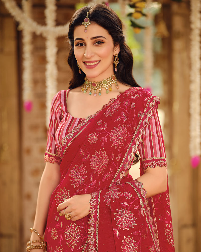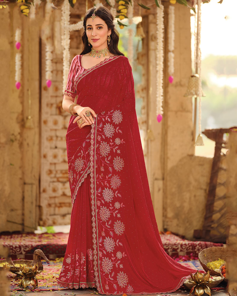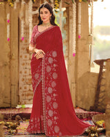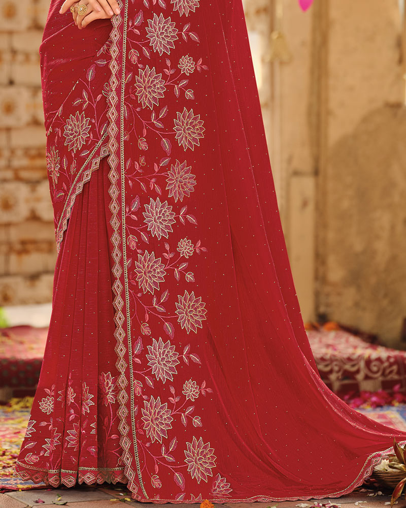 Vishal Prints Maroon Dyed Designer Chiffon Saree With Embroidery-Diamond Work And Cut Work Embroidery Border