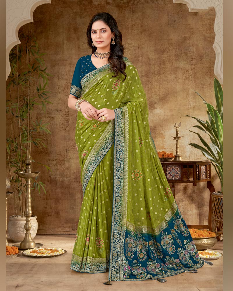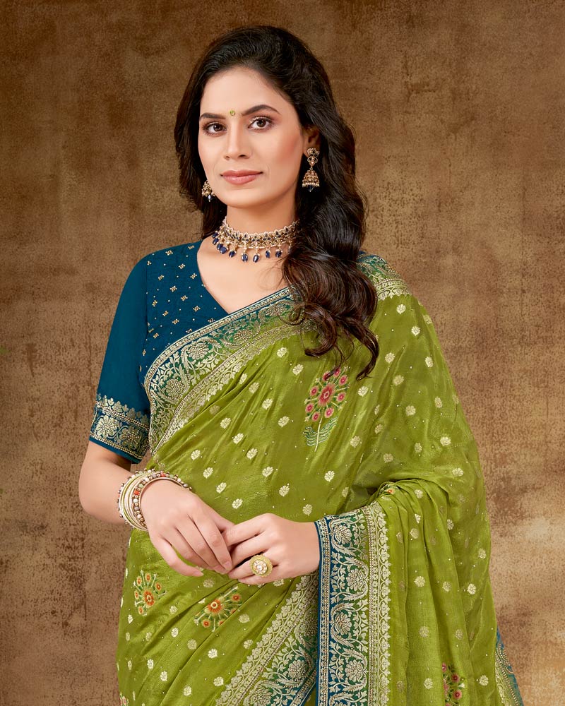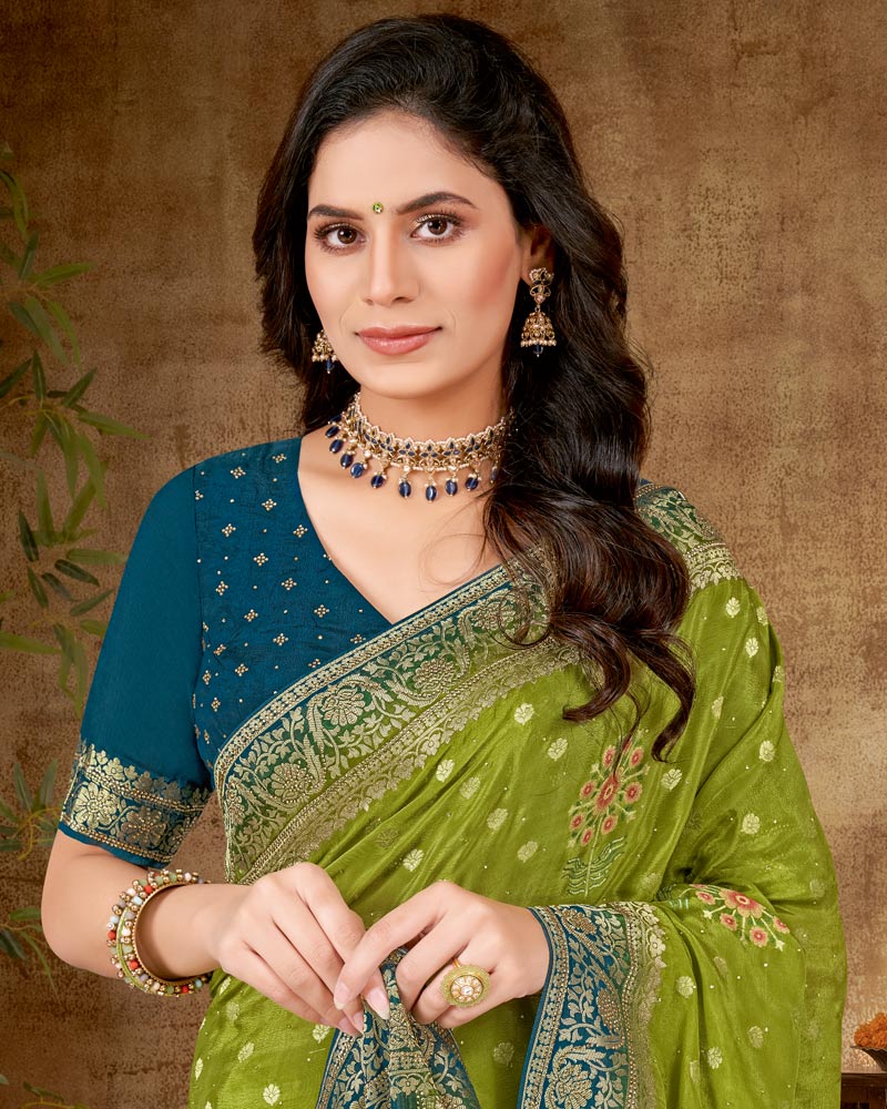 Vishal Prints Mehandi Green Designer Dola Weaving Saree With Diamond Work And Weaving Border