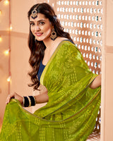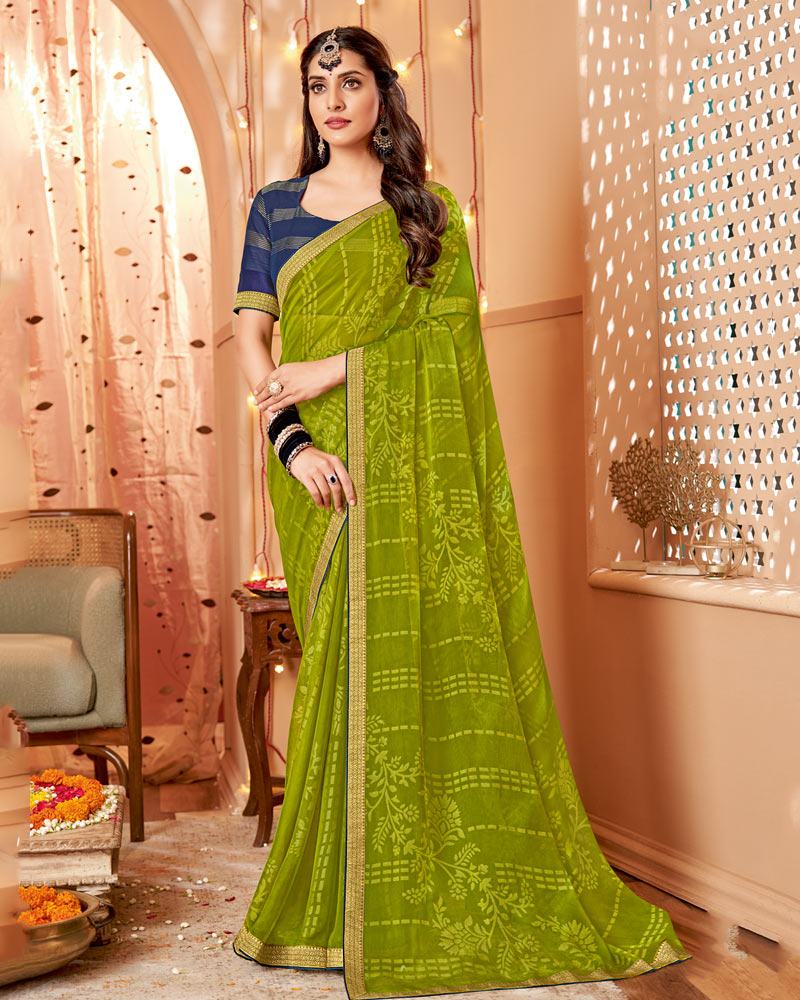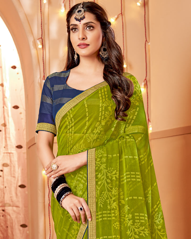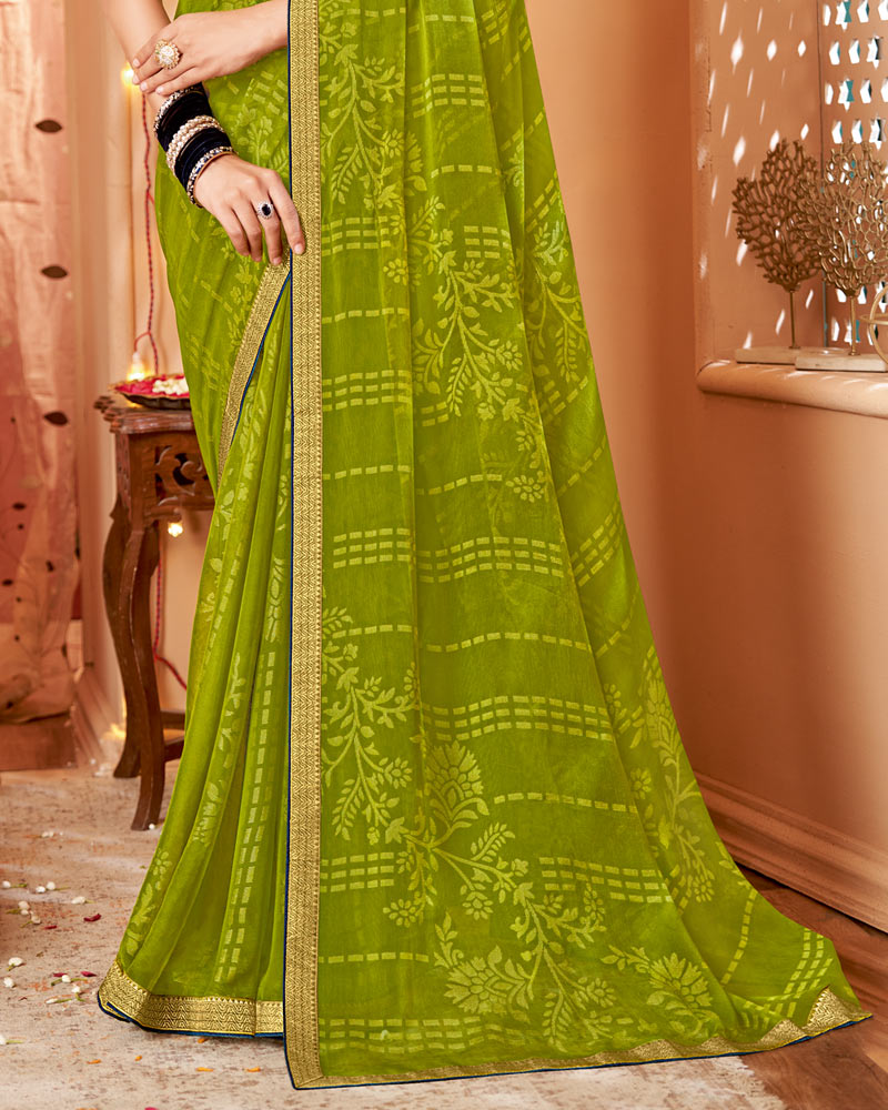 Vishal Prints Mehandi Green Dyed Chiffon-Brasso Saree With Zari Border