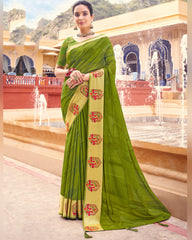 Vishal Prints Mehandi Green Printed Chiffon Saree With Foil Print, Weaved Viscose Patta And Border