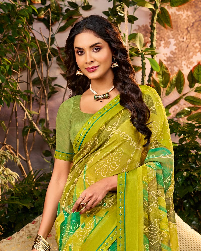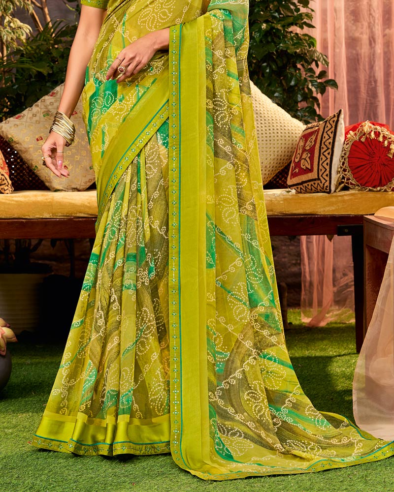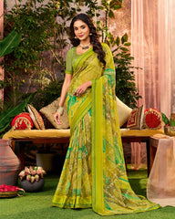 Vishal Prints Mehandi Green Printed Georgette Saree With Weaved Satin Patta And Fancy Border