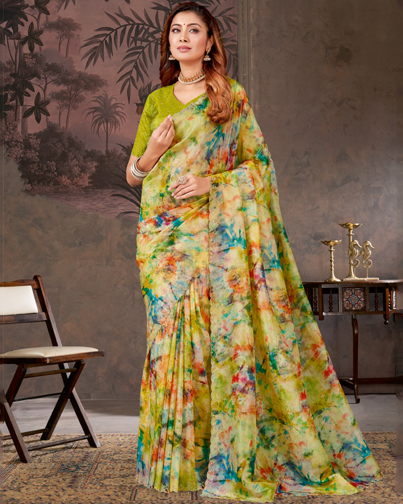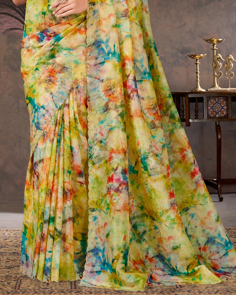 Vishal Prints Multicolored Designer Fancy Chiffon Digital Print Saree With Diamond Work And Cut Work Border