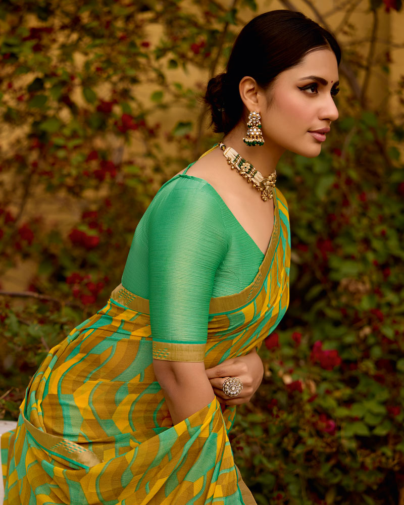 Vishal Prints Mustard Printed Brasso Saree With Fancy Border