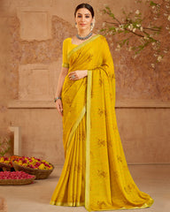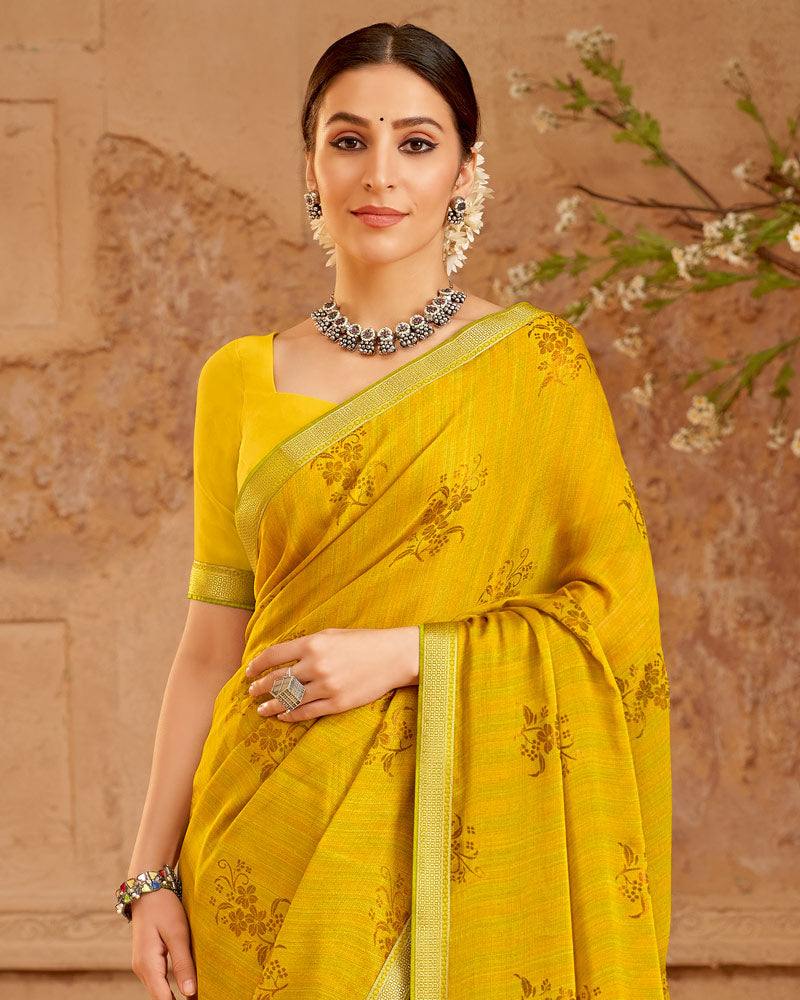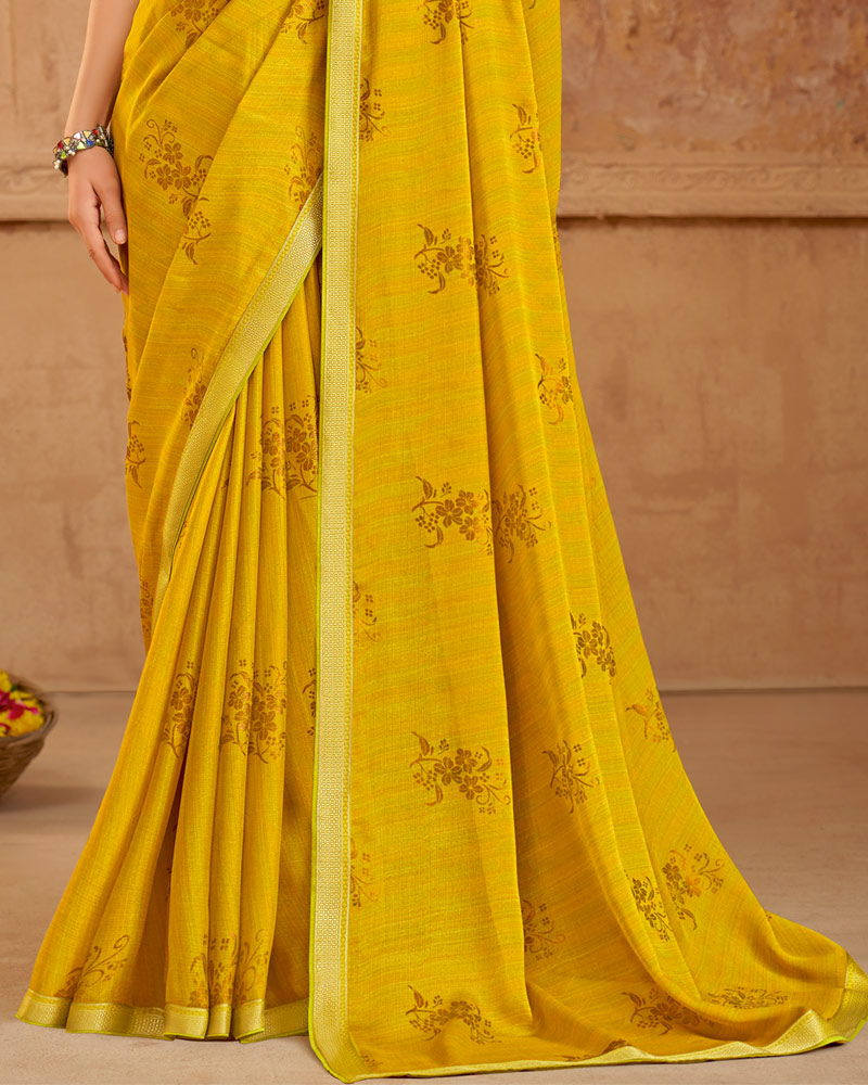 Vishal Prints Mustard Printed Chiffon Saree With Foil Print And Zari Border