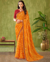 Vishal Prints Mustard Printed Chiffon Saree With Foil Print And Zari Border