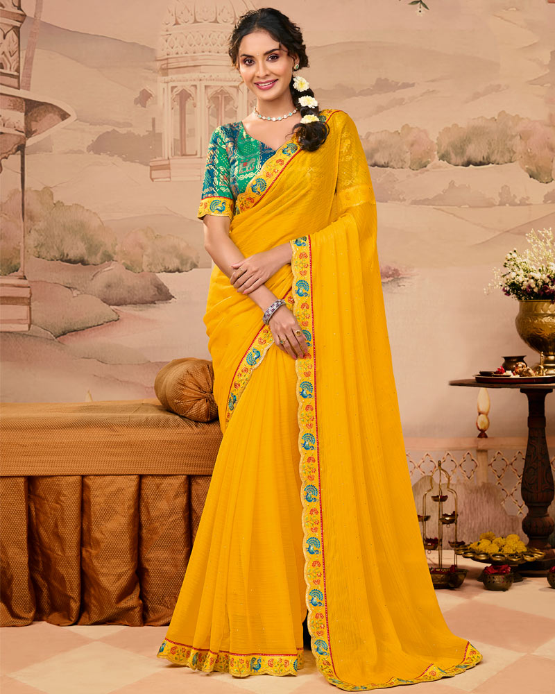 Vishal Prints Mustard Yellow Designer Fancy Chiffon Saree With Diamond Work And Cut Work Embroidery Border