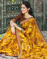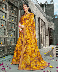 Vishal Prints Mustard Yellow Printed Chiffon Saree With Zari Border