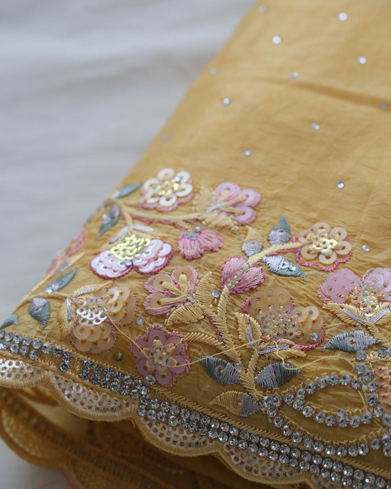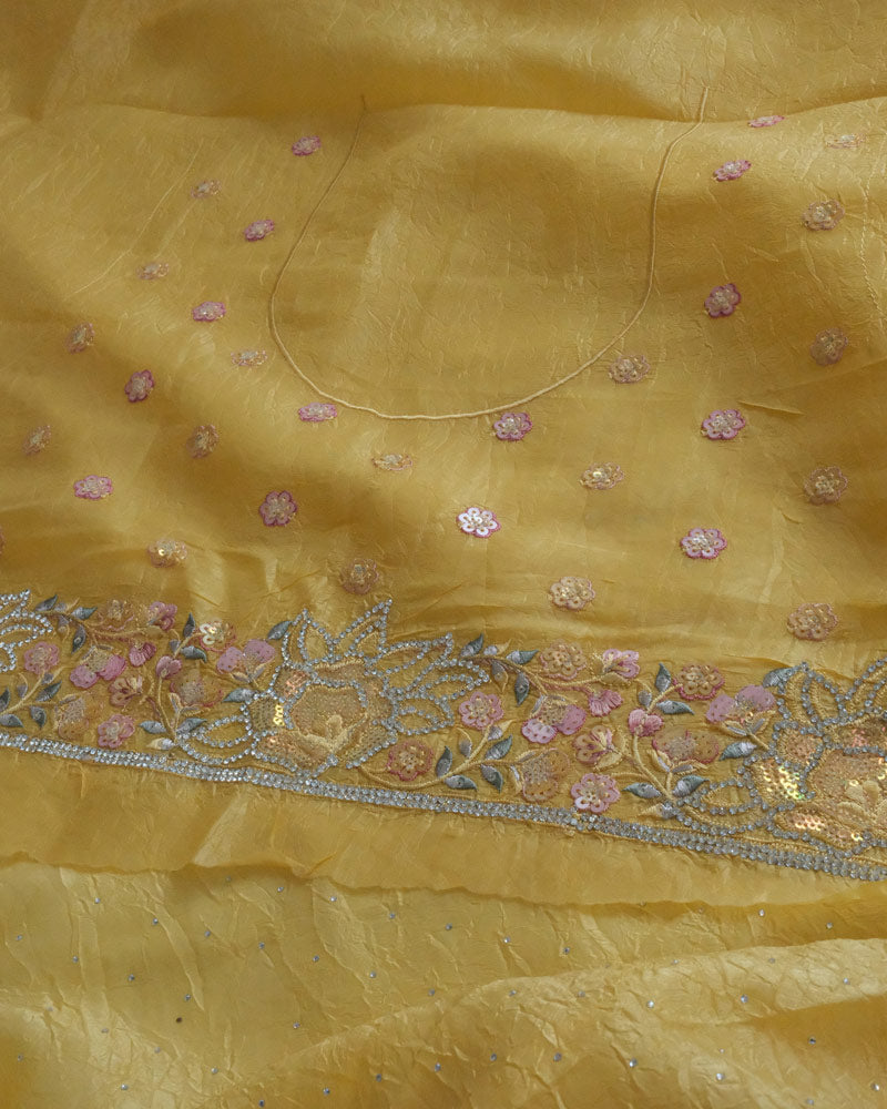 Vishal Prints Mustard Yellow Tissue Organza Saree With Multi Sequence Embroidery-Diamond Work And Cut Work Border