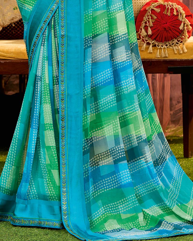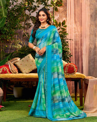 Vishal Prints Neelkanth Blue Printed Georgette Saree With Weaved Satin Patta And Fancy Border
