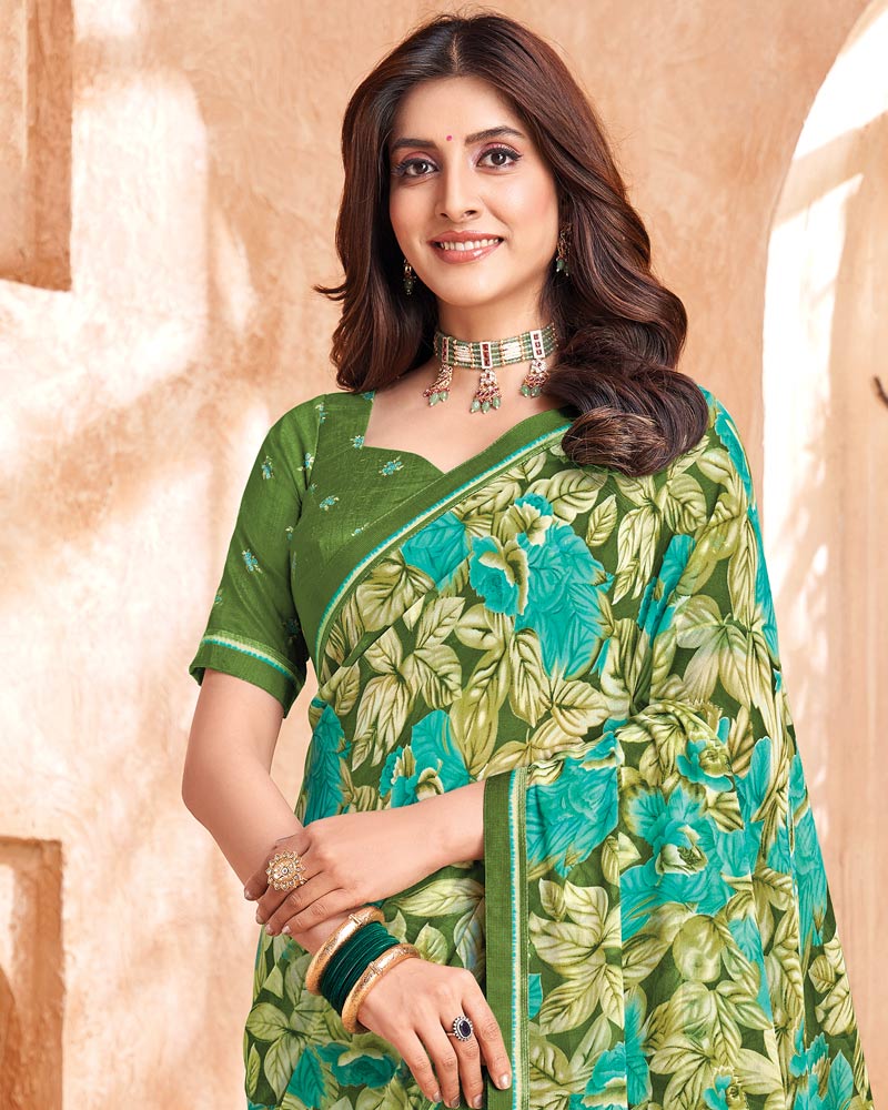 Vishal Prints Olive And Sea Green Printed Georgette Saree With Fancy Border