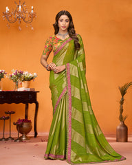 Vishal Prints Olive Green Designer Chiffon Brasso Saree With Diamond Work And Tassel