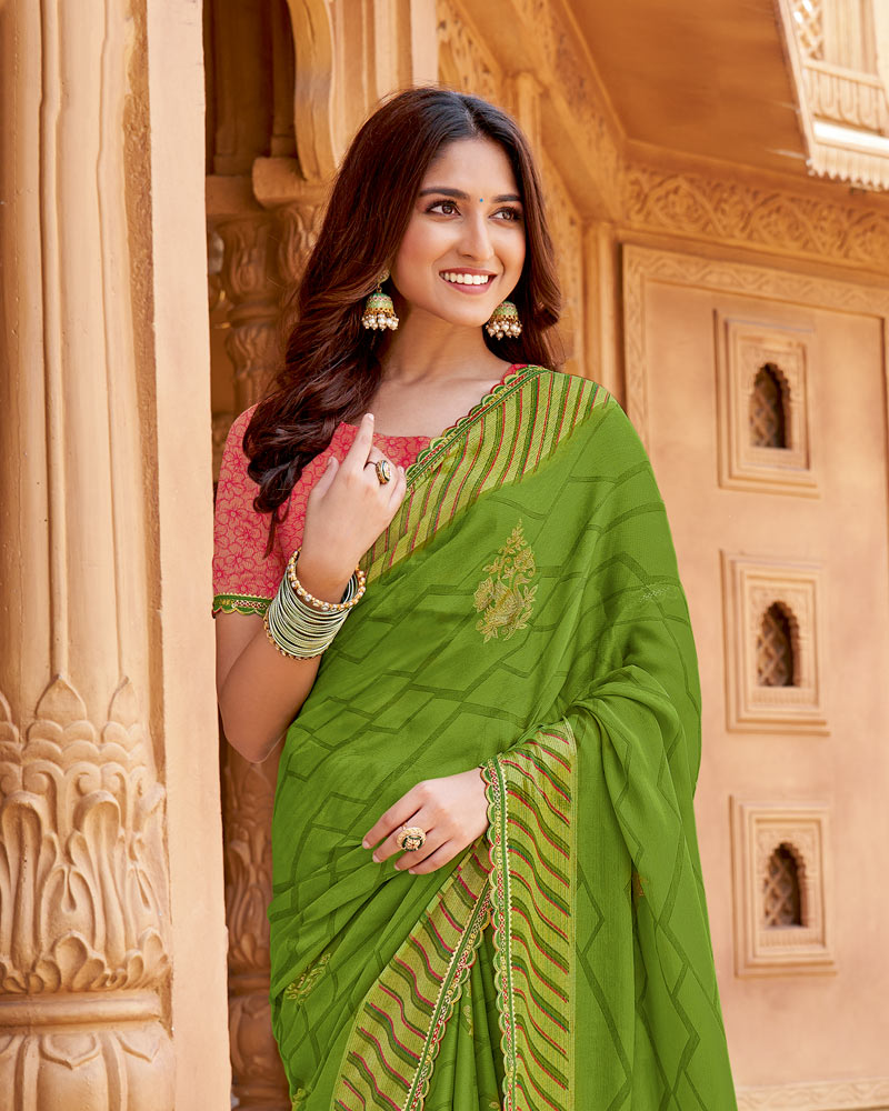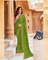 Vishal Prints Olive Green Printed Chiffon Saree With Foil Print And Cut Work Border