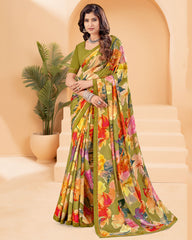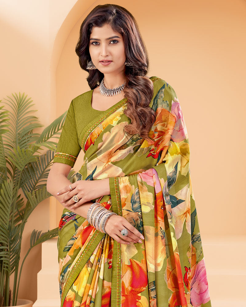 Vishal Prints Olive Green Printed Criva Crepe Saree With Printed Fancy Border