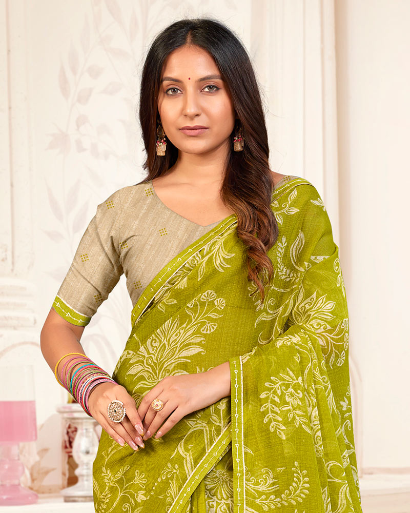 Vishal Prints Olive Yellow Printed Chiffon Saree With Fancy Border