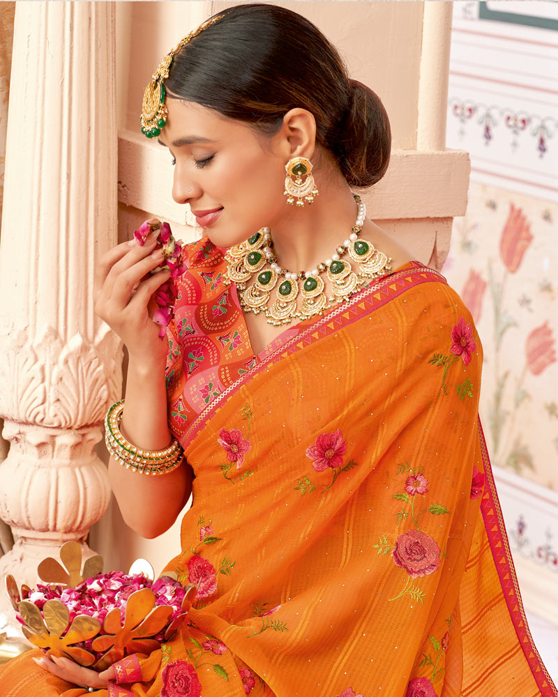 Vishal Prints Orange Designer Patterned Chiffon Saree With Embroidery-Diamond Work And Border