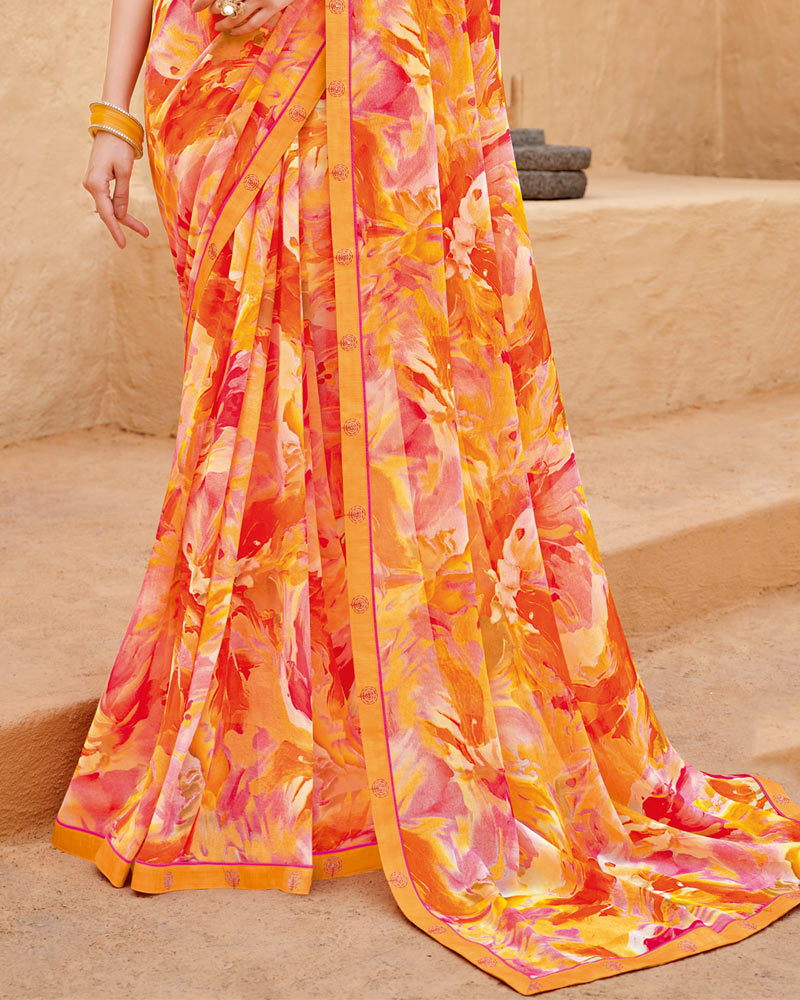 Vishal Prints Orange Pink Georgette Printed Saree With Fancy Border