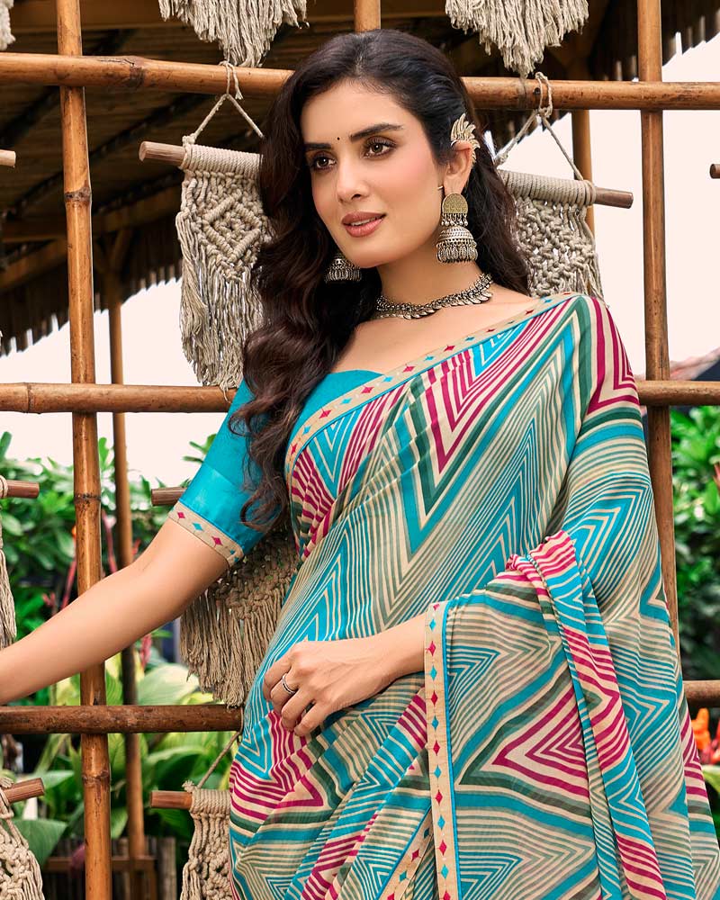 Vishal Prints Pacific Blue And Jade Green Printed Georgette Saree With Fancy Border
