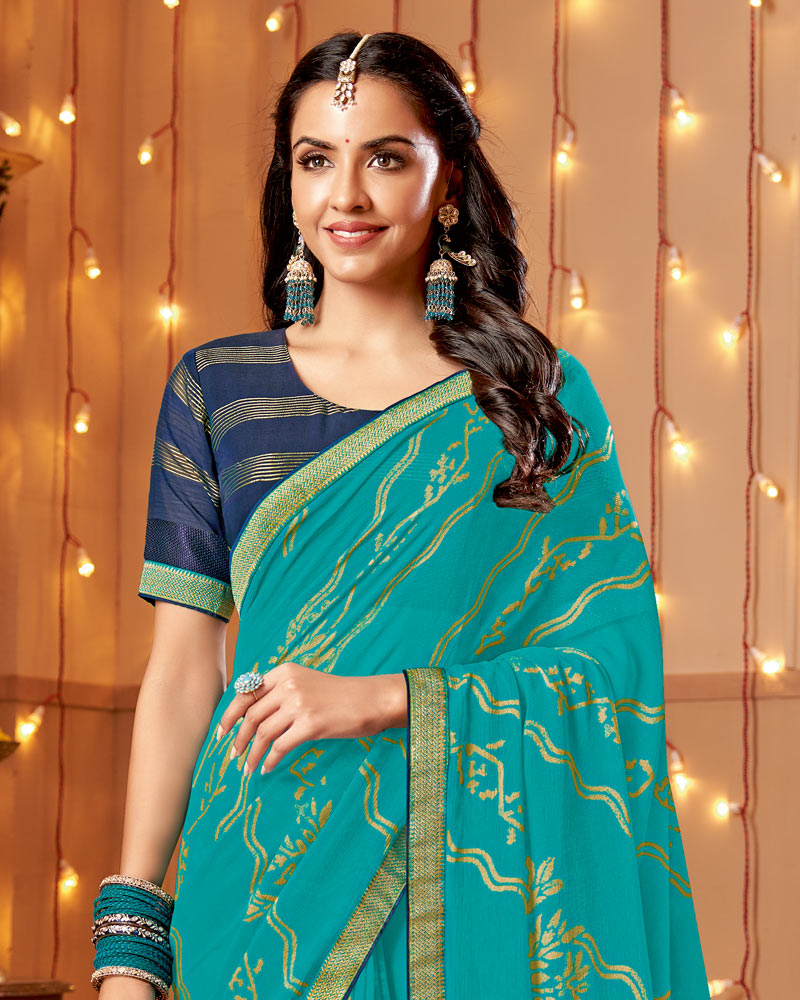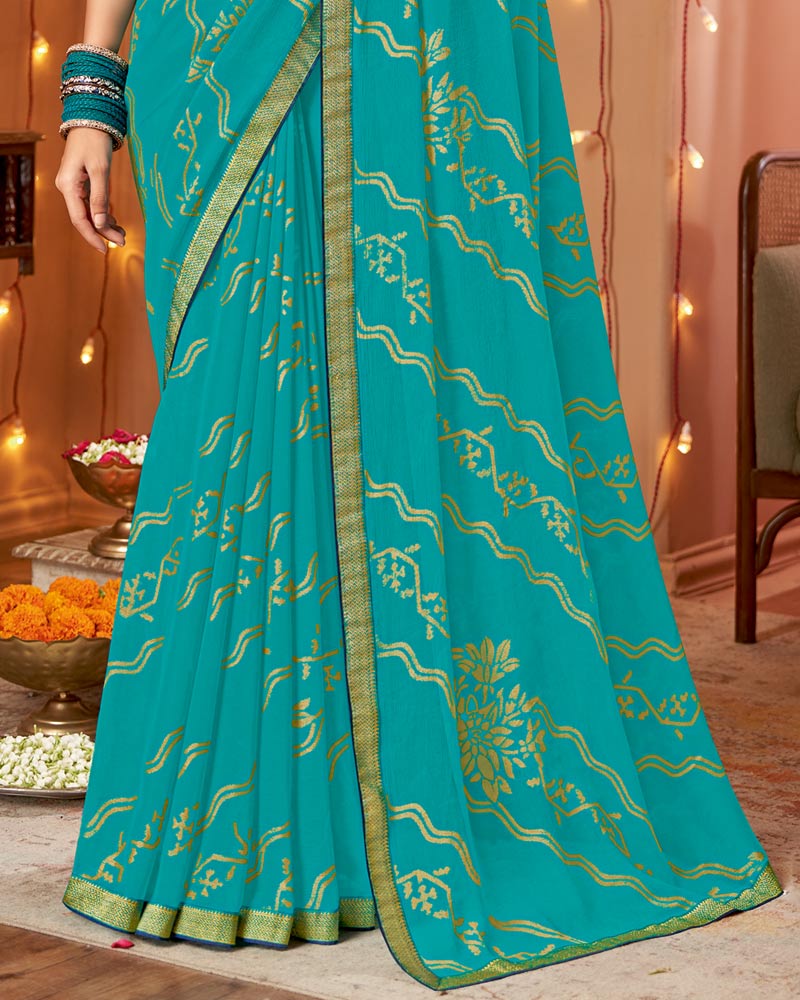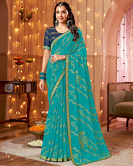 Vishal Prints Pacific Blue Dyed Chiffon-Brasso Saree With Zari Border