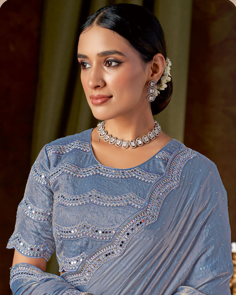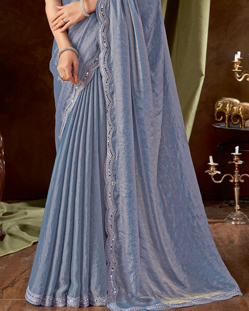 Vishal Prints Pastel Blue Designer Satin-Chiffon Saree With Embroidery-Mirror Work And Cut Work Border